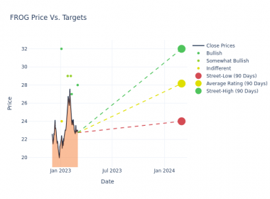 Read More 1 minute read Analyst Ratings News Price Target Needham Maintains Buy on JFrog, Raises Price Target to $28 By Benzinga Newsdesk Today, 7:18 AM Needham analyst Mike Cikos maintains JFrog (NASDAQ:FROG) with a Buy and raises the price target from $26 to $28. FROG