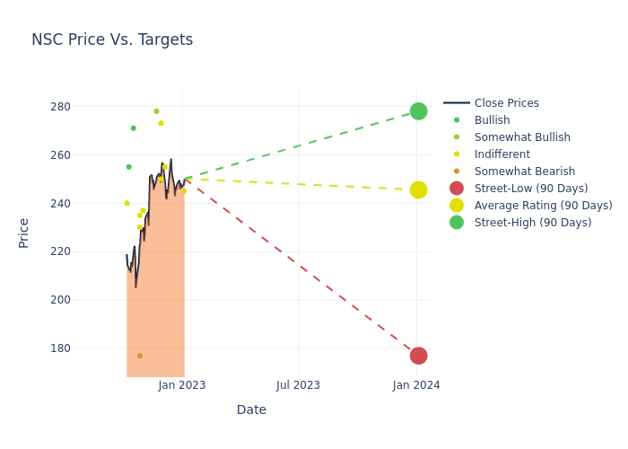 According to 17 analyst offering 12-month price targets in the last 3 months, Norfolk Southern has an average price target of $249.88 with a high of $285.00 and a low of $177.00.
