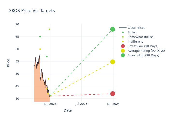 According to 10 analyst offering 12-month price targets in the last 3 months, Glaukos has an average price target of $56.7 with a high of $69.00 and a low of $42.00.