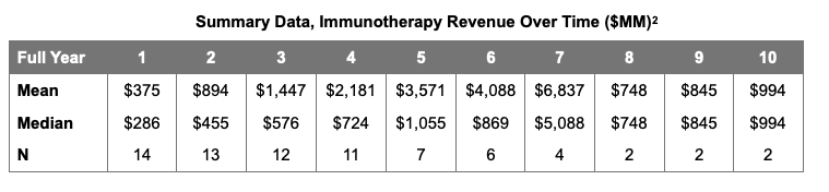 In order to update our pricing and revenue assumptions for Multikine and for other immunotherapies, we conducted an analysis on revenue data available through EvaluatePharma. The data were downloaded, scrubbed and analyzed. We recorded total IO revenues that were patent protected or approved under exclusivity, aligning them by year of first commercialization. The effort yielded revenue arcs over the life of a product, as well as summary statistics on their size.