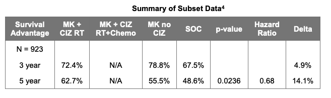 On June 28, 2021, CEL-SCI reported selected data from the IT-MATTERS trial. While details for the primary endpoint were not provided, an important subset of the population in the Multikine arm produced a statistically significant 14.1% improvement in overall survival (OS) relative to standard of care (SoC). The p-value for the 5-year result was 0.0236 and the Hazard Ratio (HR) was 0.683 in a population representing about 40% of all advanced primary squamous cell carcinoma of the head and neck (SCCHN) patients. No safety issues were reported in the study population. We summarize below the key data provided by the company: