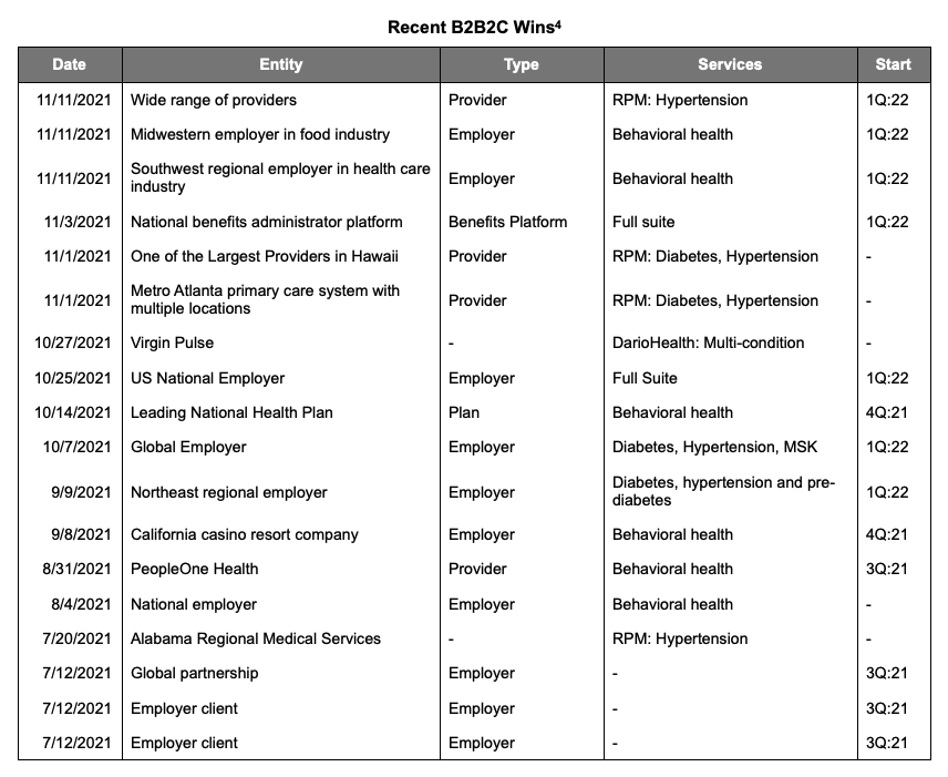 Dario announced three new contracts on November 11, 2021 including two new employers and a new provider partner, all of which will begin in 1Q:22. One of the clients is a health care provider in the southwest region and another is a Midwest-based player in the food industry both adding behavioral health services. Finally, a provider contract will launch the RPM solution for hypertension in California.