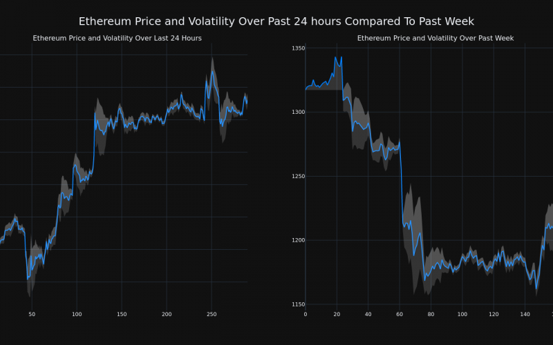 The chart below compares the price movement and volatility for Ethereum over the past 24 hours (left) to its price movement over the past week (right). The gray bands are Bollinger Bands, measuring the volatility for both the daily and weekly price movements. The wider the bands are, or the larger the gray area is at any given moment, the larger the volatility.