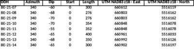 Holes BE-21-08 to BE-21-11 are centred on the East lens marked historically by higher grades. These holes were all drilled on the same section as historical holes attempting to duplicate and extend the influence of historical results such as 10.3 g/t over 11.4m from hole BE12-014.  The 2021 drill grid covered 100 meters along dip and this, between a vertical depth of 100 and 250 metres. Observations made so far all indicate a variable thickness of the gold-bearing structure between 9.5 and 50.3 metres. Strong alteration zones characterized by the feldspar-iron carbonate-sericite alteration were intersected in holes BE-12-08 and BE-12-09 with strong pyritization and chalcopyrite occurrences.