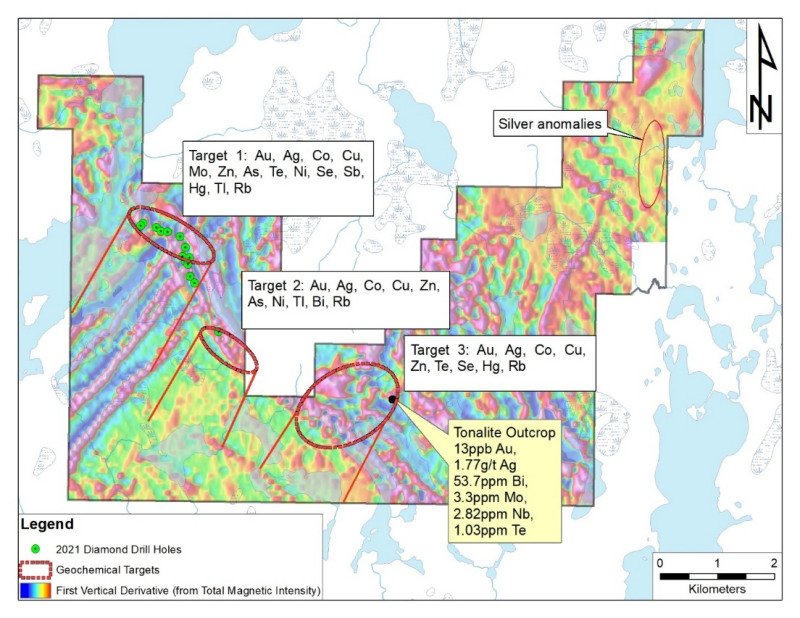 Target 2 is located near the center of the Property. It is defined by precious (Au, Ag), base metals (Co, Cu, Zn) and trace elements (As, Ni, Tl, Bi, Rb) anomalies in the soil samples. This anomaly is located close to the historical boulder discoveries (outside of the Property) that assayed 9.2 g/t Au + 1.8% Cu (sample K-93-62) and 6.2 g/t Au + 0.85% Cu (K-92-53). The follow-up will include prospecting for other similar boulders to define a potential local source.