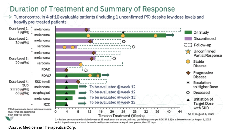 On August 9, 2022, Medicenna Therapeutics Corp. (NASDAQ:MDNA) filed a voluntary supplement with the U.S. SEC that contained an update on the ongoing Phase 1/2 ABILITY Study (A Beta-only IL-2 ImmunoTherapY Study) of MDNA11 in patients with advanced solid tumors (NCT05086692). The update included a report of an unconfirmed partial response in a patient with pancreatic ductal adenocarcinoma. This is the fourth patient out of ten evaluable that had at least one on-treatment imaging scan to achieve tumor control (defined as stable disease, partial response, or complete response as per RECIST 1.1). The following image shows the responses for the 10 evaluable patients, with an additional four patients at the 60 μg/kg dose level anticipated to have 12-week scans in September.