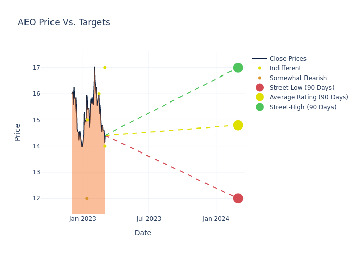 According to 7 analyst offering 12-month price targets in the last 3 months, American Eagle Outfitters has an average price target of $15.43 with a high of $17.00 and a low of $12.00.