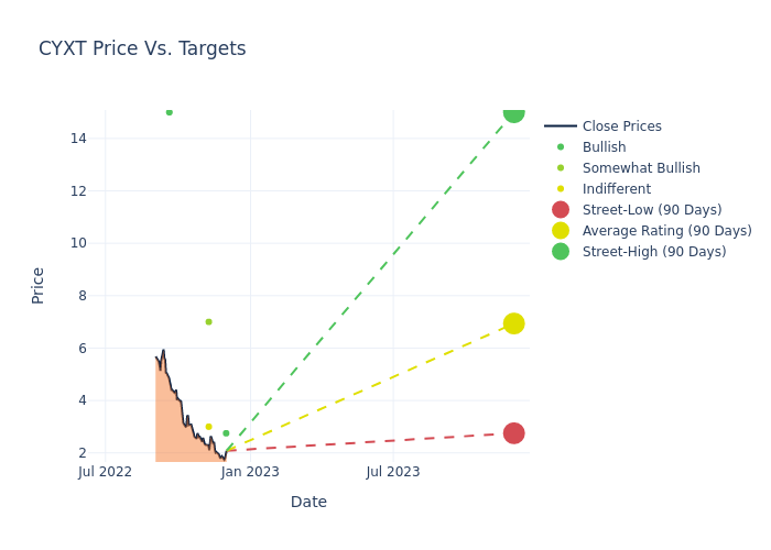 According to 4 analyst offering 12-month price targets in the last 3 months, Cyxtera Technologies has an average price target of $6.94 with a high of $15.00 and a low of $2.75.