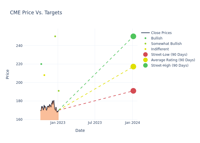 According to 5 analyst offering 12-month price targets in the last 3 months, CME Group has an average price target of $216.4 with a high of $250.00 and a low of $191.00.