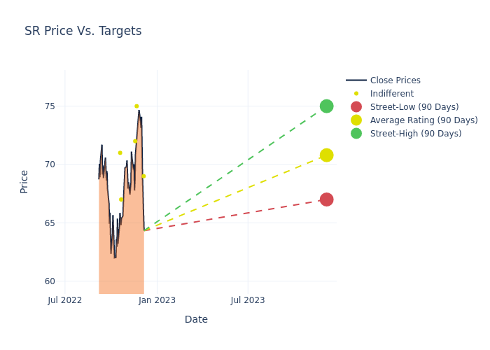 In the last 3 months, 7 analysts have offered 12-month price targets for Spire. The company has an average price target of $72.71 with a high of $78.00 and a low of $67.00.