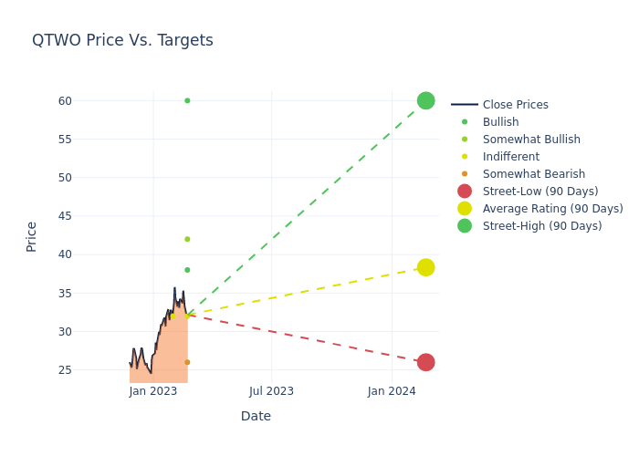 According to 6 analyst offering 12-month price targets in the last 3 months, Q2 Holdings has an average price target of $38.33 with a high of $60.00 and a low of $26.00.